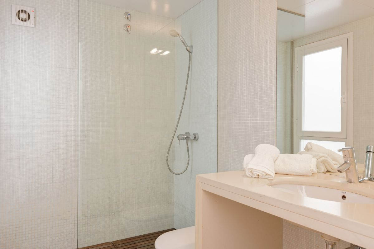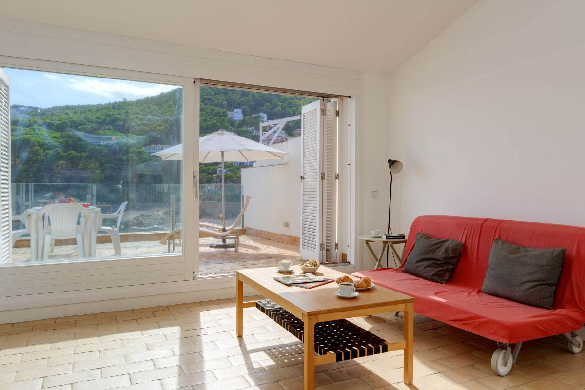 The second floor includes another living room, with a sofa bed for two people, and direct access to a spectacular sunbathing terrace, with the best view over the sea and the bay of Tamariu.