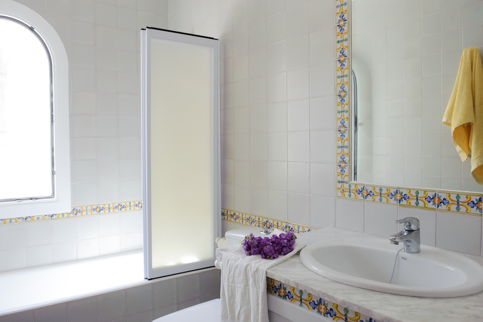 The large and well kept lawned garden with tall palm trees and old pine trees provide a nice shade. There is a large sided covered terrace with a sitting area with sofas to relax and table with chairs to enjoy delicious "al fresco" evening meals. The pool area is really pleasant with a lovely pool ( salt water system) with roman steps, a large sun terrace with modern reclining sun beds and a sitting area -the ideal spot to relax and enjoy the long and sunny summery days-. There is also an open poolside shower and a brick-built barbecue.
