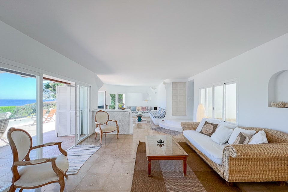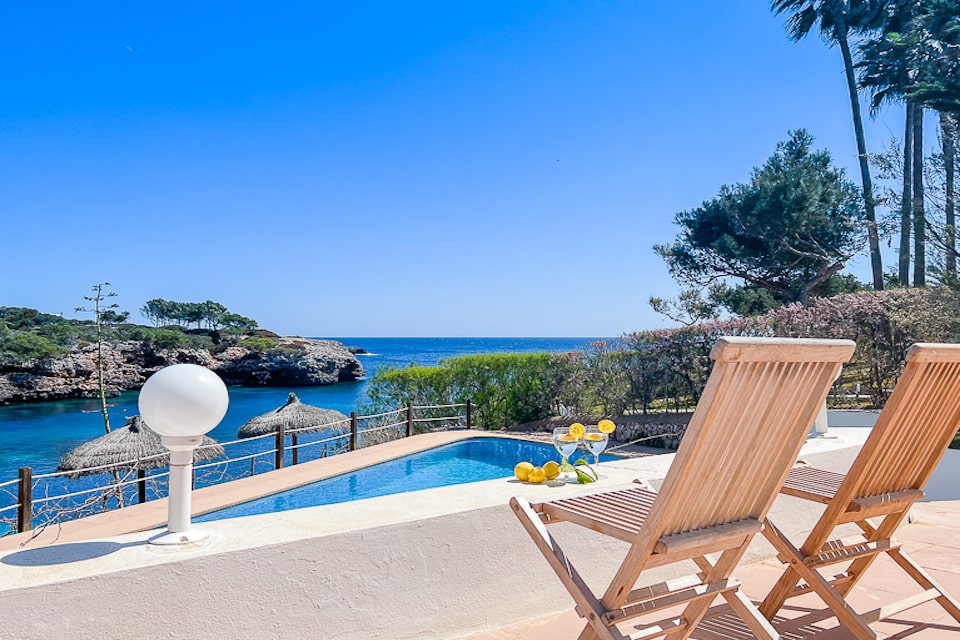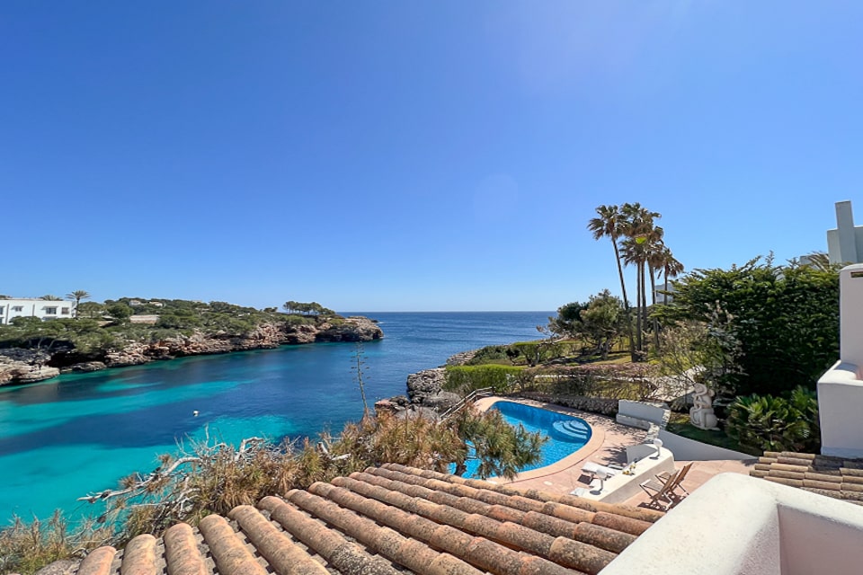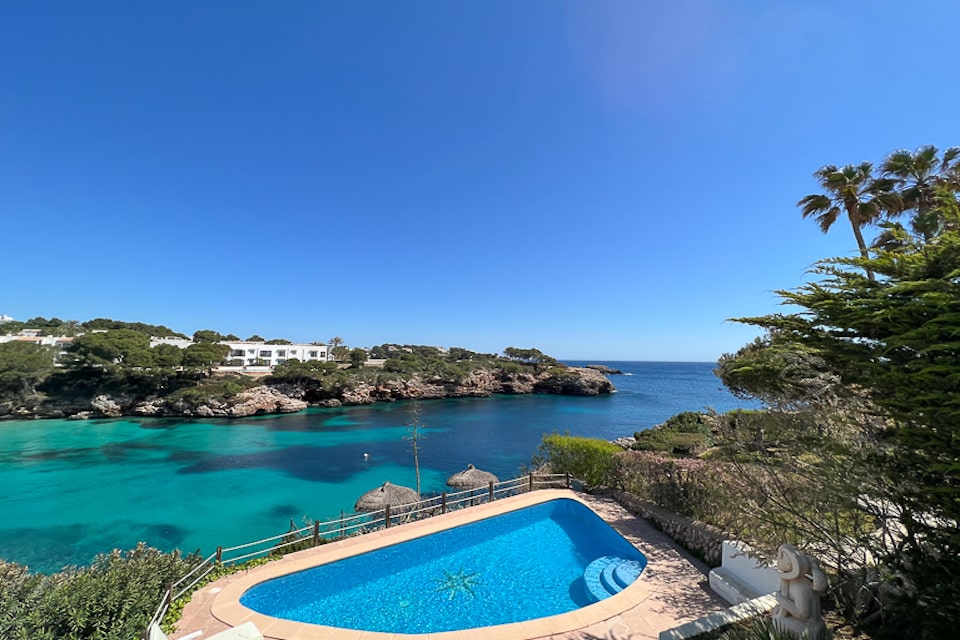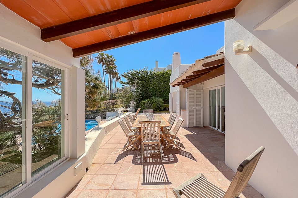Spacious Ibiza-style villa in Cala D'or for 10 people to rent on the seafront, a few meters from Cala Esmeralda beach, Cala D'Or. Enjoy an excellent location, with wonderful views. Pool and terraces with views. It has access to the sea from the rocks and it is easily reached swimming to the beach.
