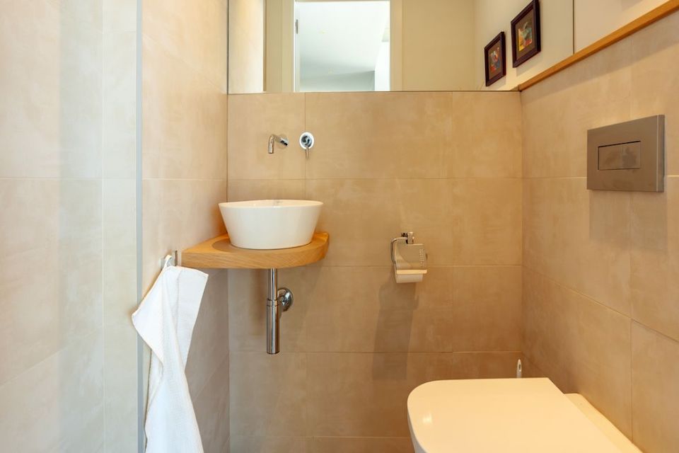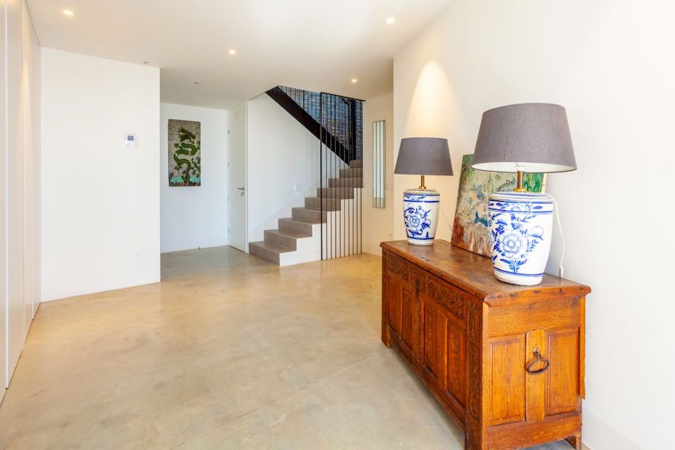 On the ground floor we find the garage and the entrance hall with access to the elevator and one toilet. On the same level is the private laundry area with washer and dryer.