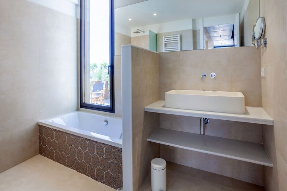 On the top floor is also and sleeping area, with the master bedroom with private bathroom with shower and bath and another bedroom with bunkbeds with private shower-room. Both with access to an amazing terrace ideal for enjoy the costa brava and relaxing reading a book on the child out. On this floor there is a pantry ideal for take a drink on the toop floor terrace.
