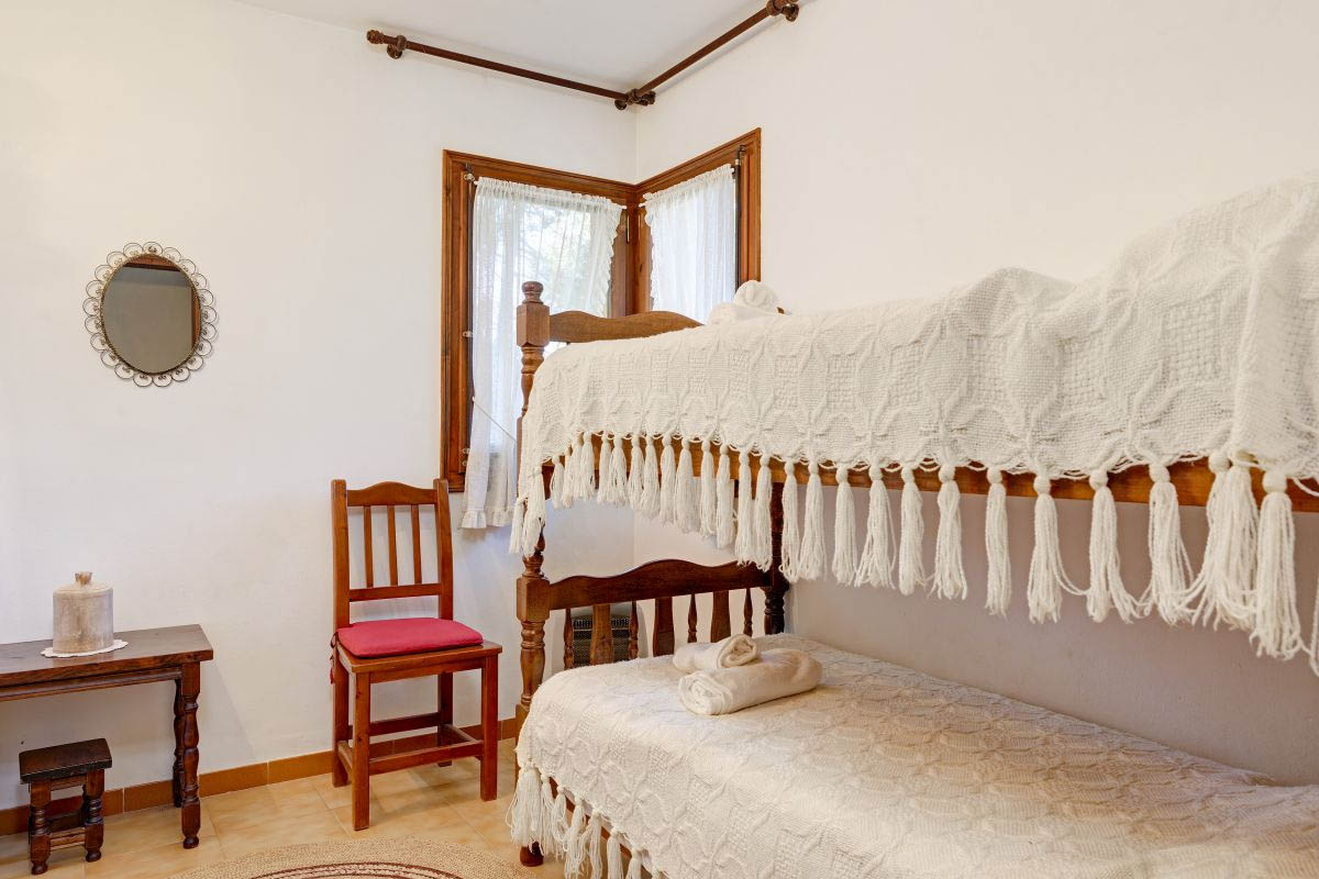 By the spiral staircase you reach the first floor, in the tower, where there are the 4 bedrooms (one twin, one double room, a single room and a room with bunk bed). There is a bathroom and a shower room.