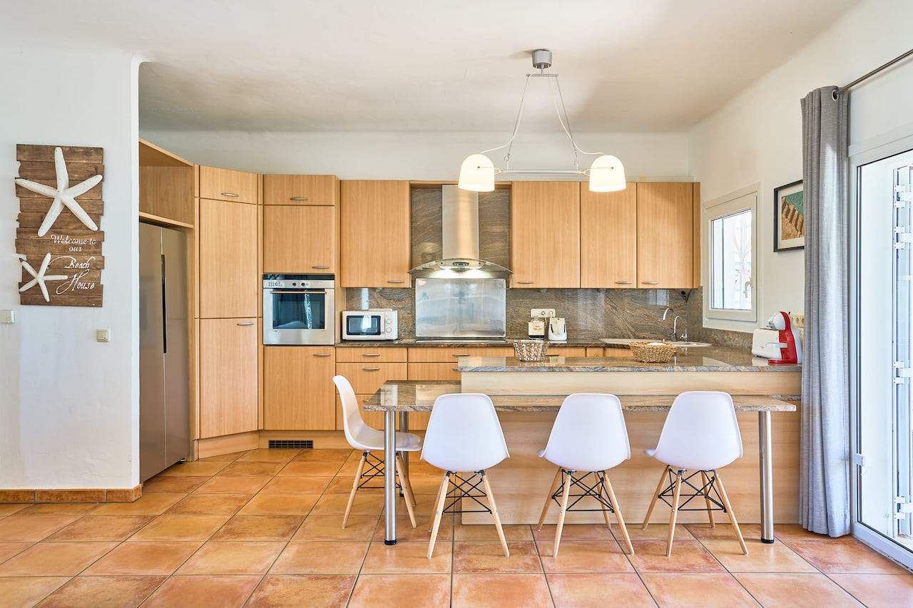 Spacious one-storey villa. From the hall there is access to the open plan kitchen with dinner counter and living room that has access to the covered terrace and garden. Close to the living room there is a double bedroom - two mattresses pushed together - with en suite bathroom that has a separate bath and shower. Guest toilet.