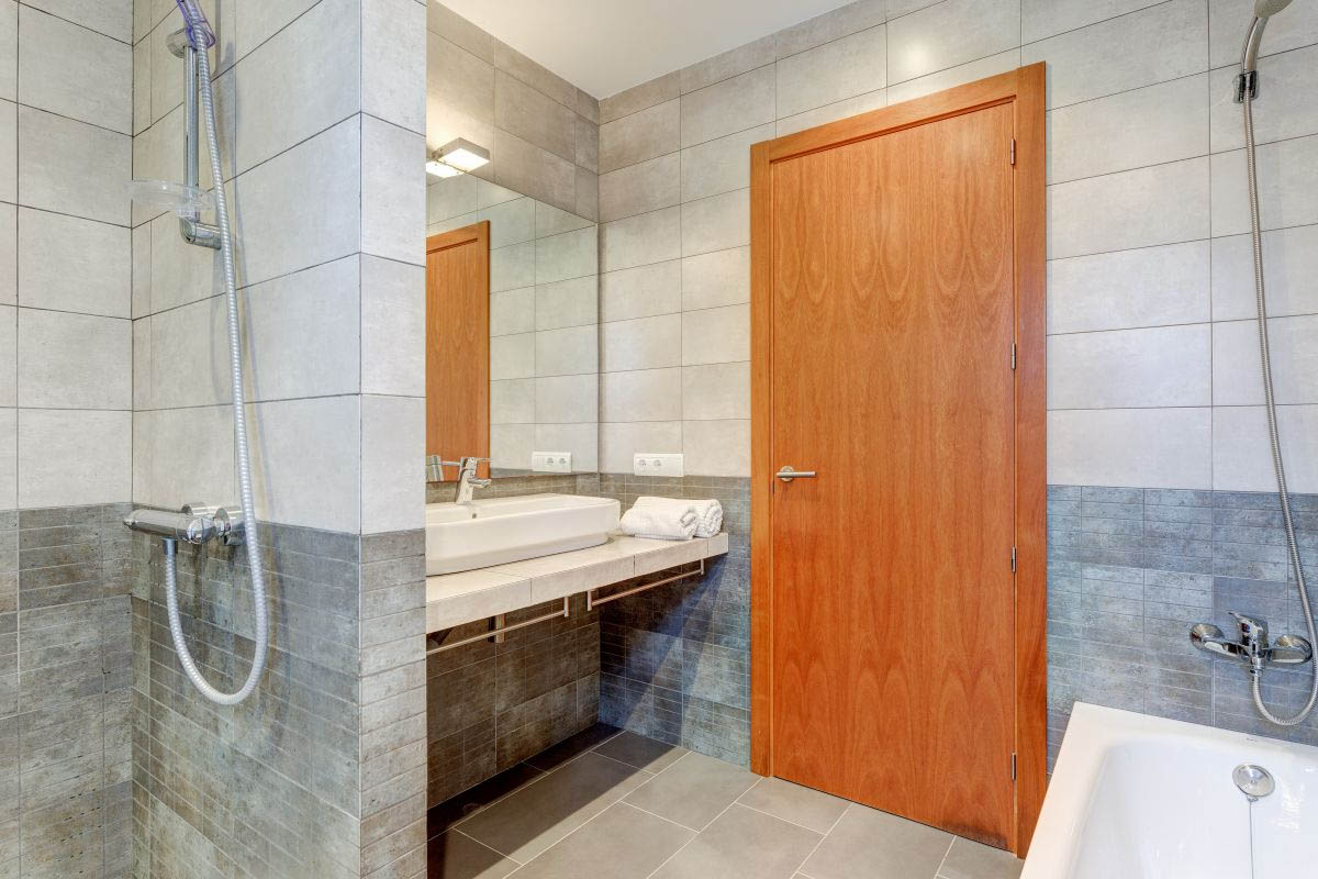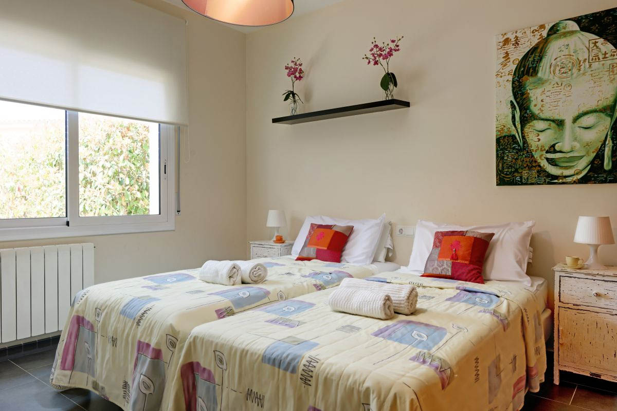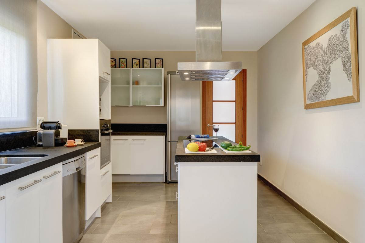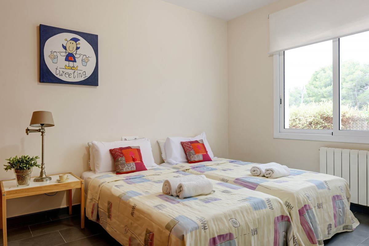 On this level we find a bright, spacious and fully equipped kitchen with ceramic hob, dishwasher, microwave and oven. Just behind the kitchen there is a guest toilet and access to two twin bedrooms which share a full bathroom.