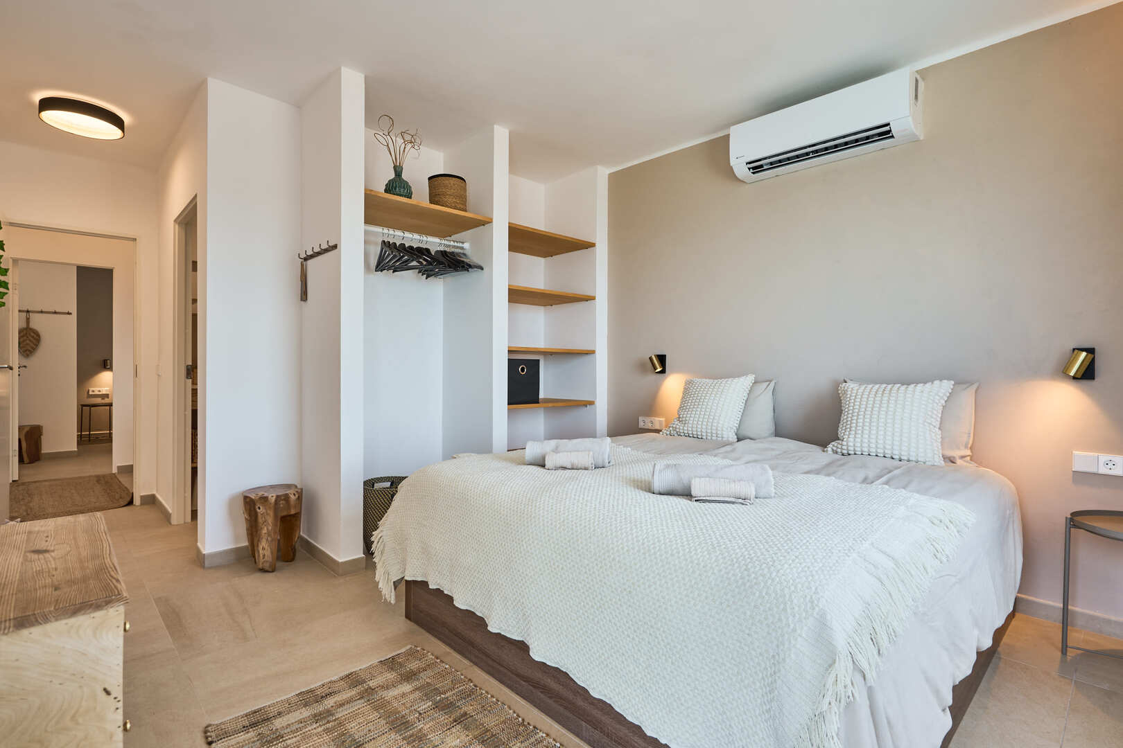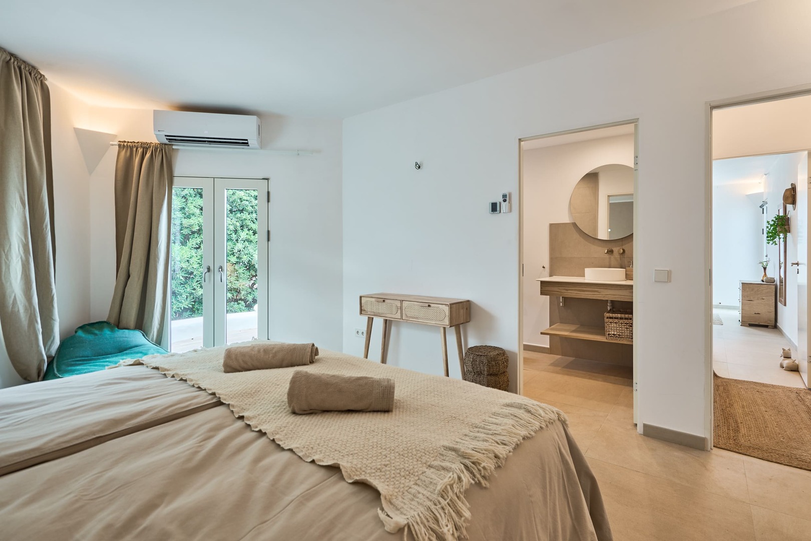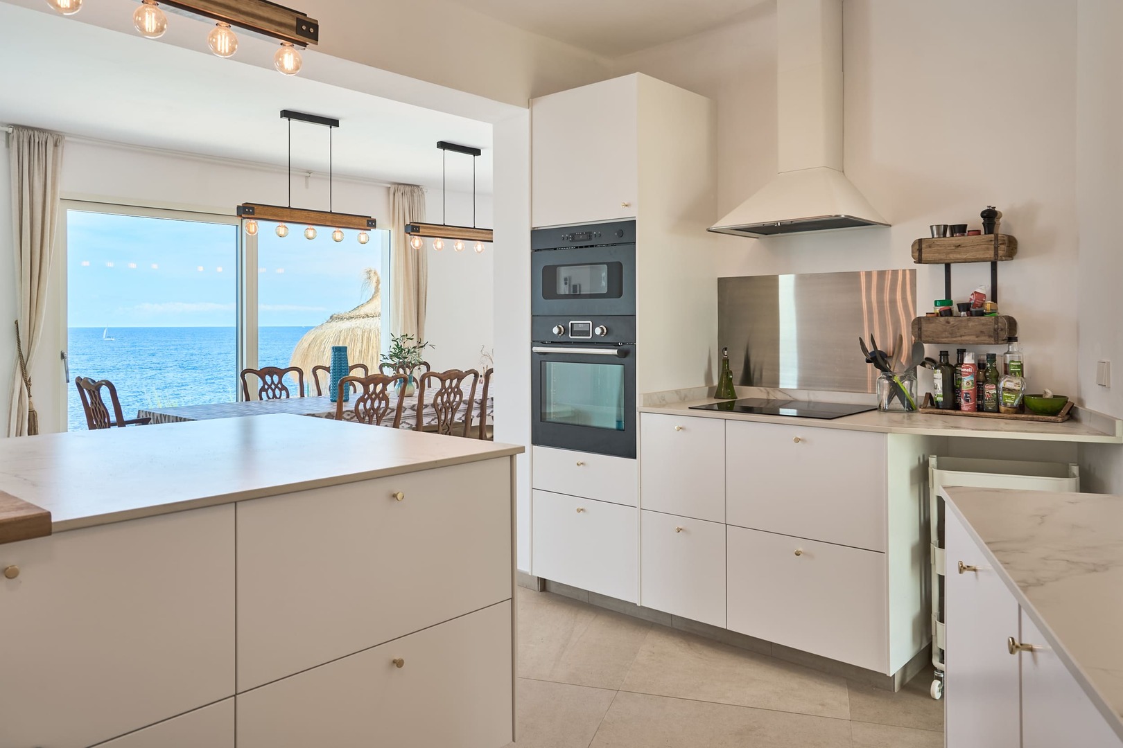 From the entrance there is access the living room with sea views (there is no TV). Right next to it is the open plan kitchen with a large dining table. Both the living room and the kitchen/dining room enjoy open views of the sea and the pool. Both have large sliding doors that connect to the terrace and the pool. Next to the kitchen is the laundry area and an exit to the front lawned garden.