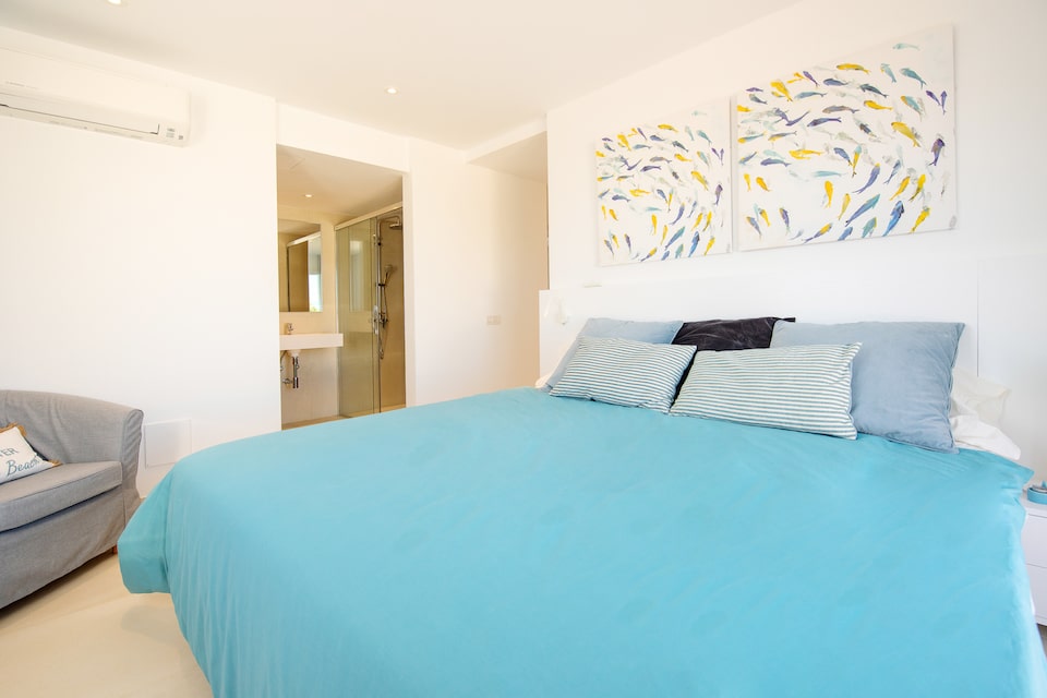 On the first floor we find two further bedrooms. The master double bedroom has a dressing area, semi-integrated shower room and access to its own terrace. The last one is a twin bedroom with en suite shower room.