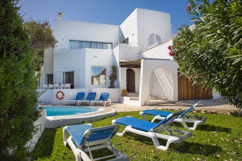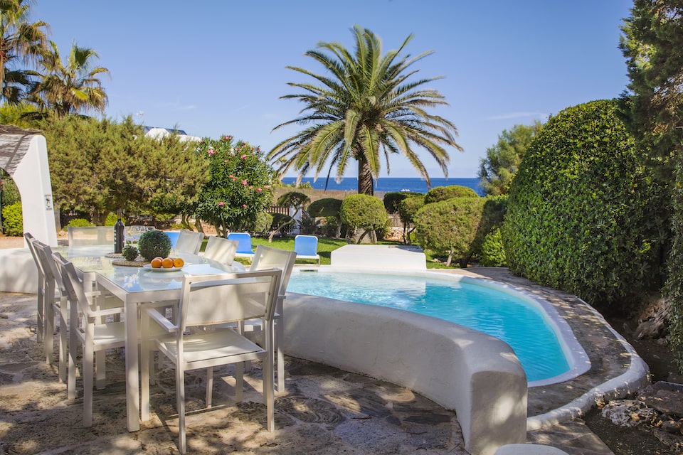 Outside the well furnished split-level terraces with a table and chairs to enjoy "al fresco" meals with open sea views. Close to the terrace there is a kidney shaped pool (6m x 4m), which has a shallow end for children. There is a well kept lawned garden with palm trees and bushes.