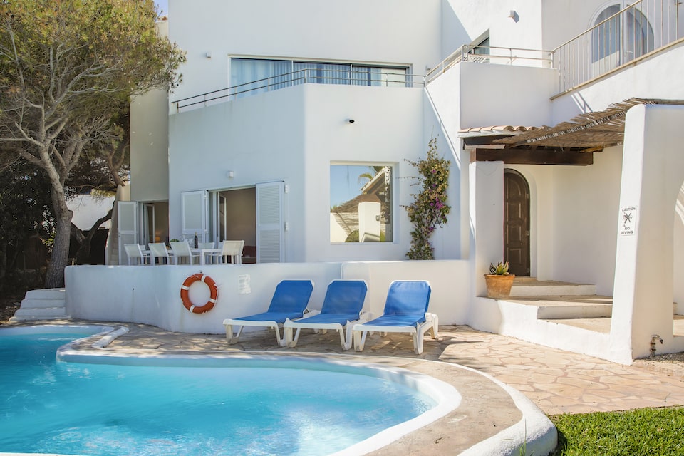 Villa Maya is designed in "Old Ibizan" style and has just undergone a complete rebuild and refurbishment. A short path leads up from its gated entrance a lawned garden to the front door. From the entrace we access directly into a spacious, airy, comfortable furnished lounge/dining room with original fireplace. Patio doors open out on to the pool area, whilst at the rear, doors lead to a more private patio area. Renovated kitchen well equipped kitchen and there is a washing machine in the garage for your added convenience.