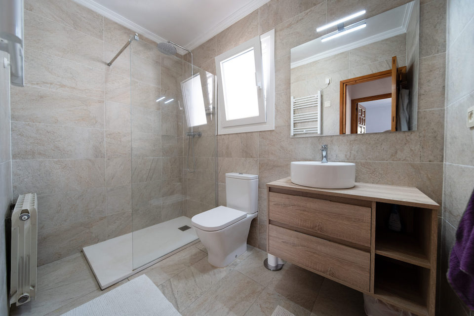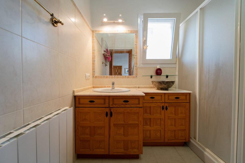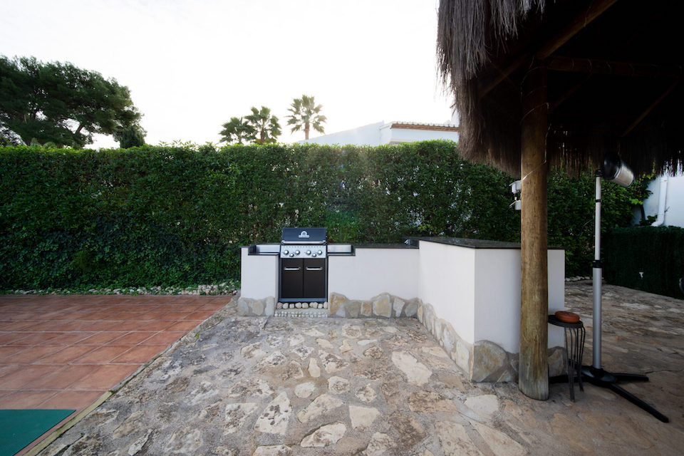 This typically Spanish, three-bedroom Javea villa is located in the urbanisation of Cap Marti, stands in spacious, secure grounds and has ample private parking. There is plenty of space for relaxing around the 10 x 5m swimming pool with roman steps, safe “astro turf” area for children to play and two patios that offers a perfect setting for al fresco dining. One patio on the upper level has a large umbrella and seats four, perfect for a quiet breakfast or lunch. The ground floor patio is under a tiki hut, complete with dining table for 8, and Broil King gas barbeque area. There is a roof terrace with additional seating and perfect sea views.