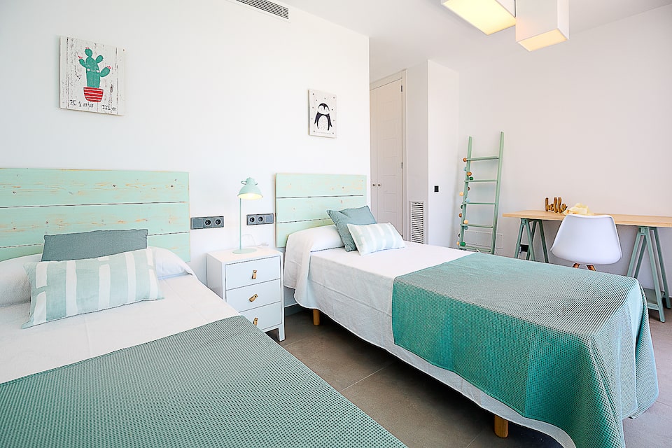 On the first floor there are three twin bedrooms, two with ensuite shower and one with en suite bath room. All have access to a balcony which leads to a terrace.