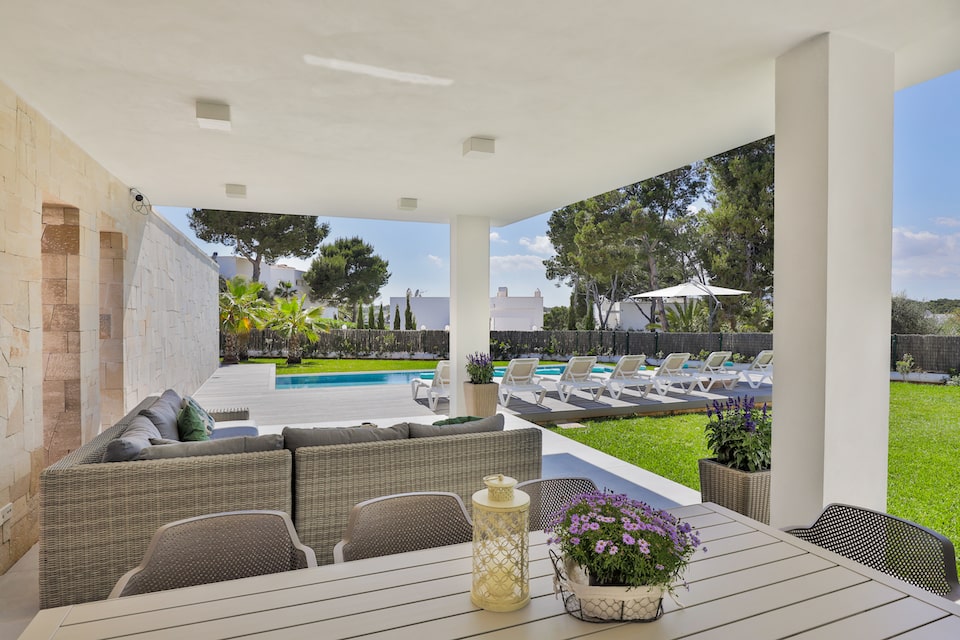 As you enter this Cala D'or villa you are welcomed with a large modern open plan living-dining room with access to the covered terrace and pool area. On the ground floor you also have the well-equipped kitchen which is connected to the living-dining room by a large sliding door. There is also a double bedroom with access to the garden and pool area, with en suite shower room.